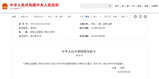 公开信息显示,《条例》是2023年的立法项目。2024年4月26日召开的国务院常务会议上,审议通过了《国有企业管理人员处分条例(草案)》。时隔月余,《条例》公开发布。